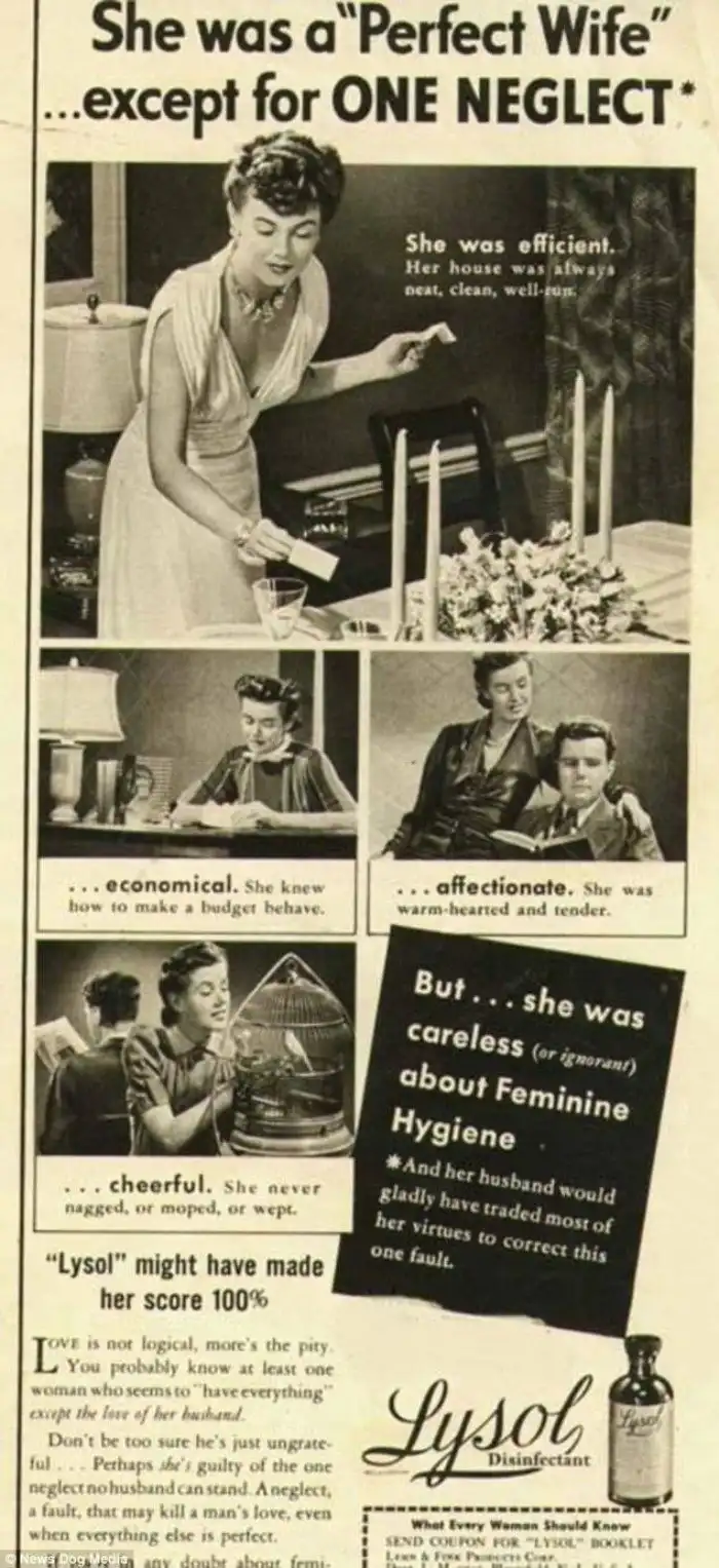 "Она была "идеальной женой" (хорошей хозяйкой, экономной, любящей, жизнерадостной) ... если не считать одного минуса: она пренебрегала женской гигиеной". Реклама дезинфицирующего средства Lysol, 1940-е гг.