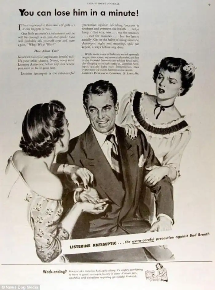"Вы можете потерять его в мгновение ока!" - если у вас плохо пахнет изо рта. Реклама ополаскивателя Listerine, 1950-е гг.
