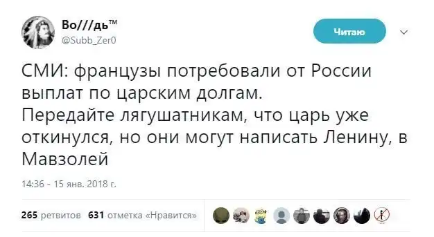 А французам встречный иск можно предъявить за спаленную Москву. Кто поджог - это фиг его знает, но в городе были их войска. Можно еще и со штатов потребовать за непоследнюю роль флота РИ в приобретении ими независимости. А вообще задрало. Долги тем... долги этим...Я вот просто не понимаю какого х... РФ выплачивает долги СССР, но при этом прощает все долги тем, кого этот СССР кормил.