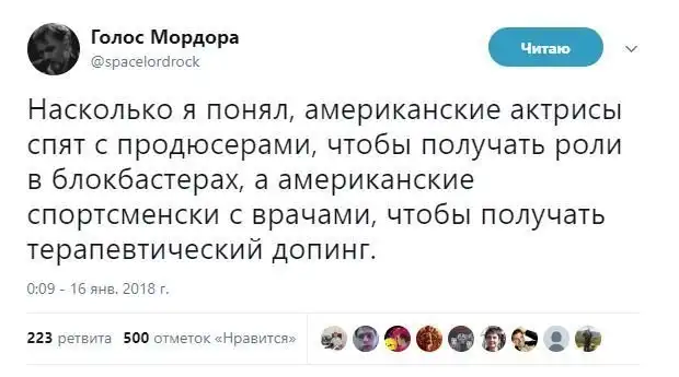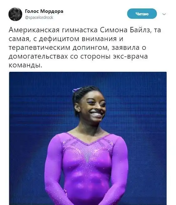Симона Байлз явно пи... преувеличивает, даже русские врачи столько не выпьют, чтоб до нее домагиваться. Тут самому как бы жертвой не стать.