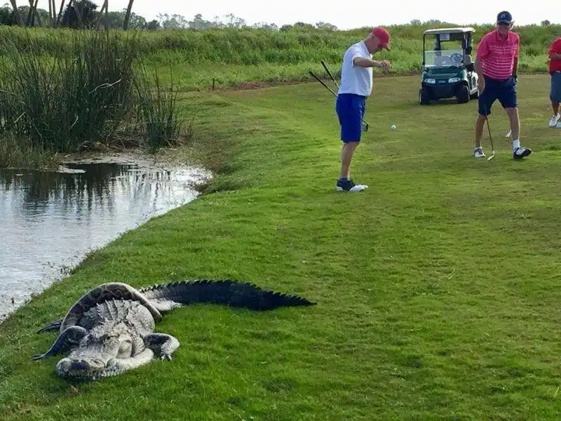 В штате Флорида прямо на поле для гольфа аллигатор и питон сошлись в смертельном поединке. Очевидцы, игравшие в это время на поле, посчитали, что победа на стороне крокодила: в его пасти находилась голова змеи, а он сам спокойно лежал с открытыми глазами. Позже гольфисты рассказали, что победитель утащил мертвого питона под воду.