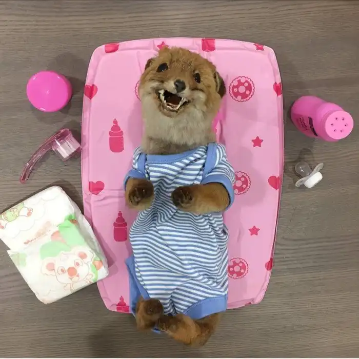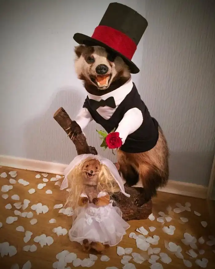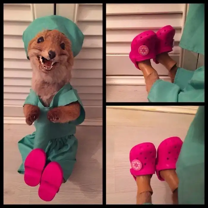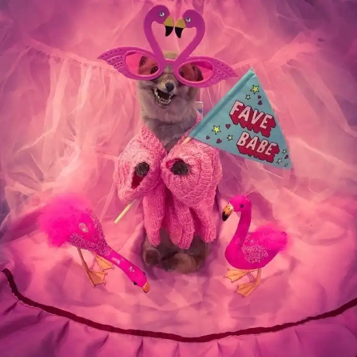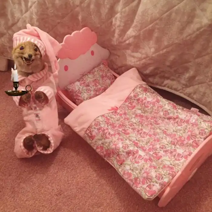 "Мне задают много вопросов по поводу таксидермии. Некоторые считают это живодерством, но я думаю, это настоящее искусство. Вы только посмотрите на это суперсимпатичное дитя! Я же не убивала лисенка специально. Его нашли сбитым на обочине дороги, а потом превратили в милое чучело. Я всегда долго выбираю ему наряд. У малыша очень большой гардероб с одеждой на все случаи".