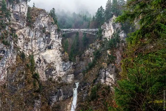 Но вот ветер разгоняет туман и вдали показывается мост Мариенбрюке. Именно отсюда открывается один из двух лучших видов на замок.