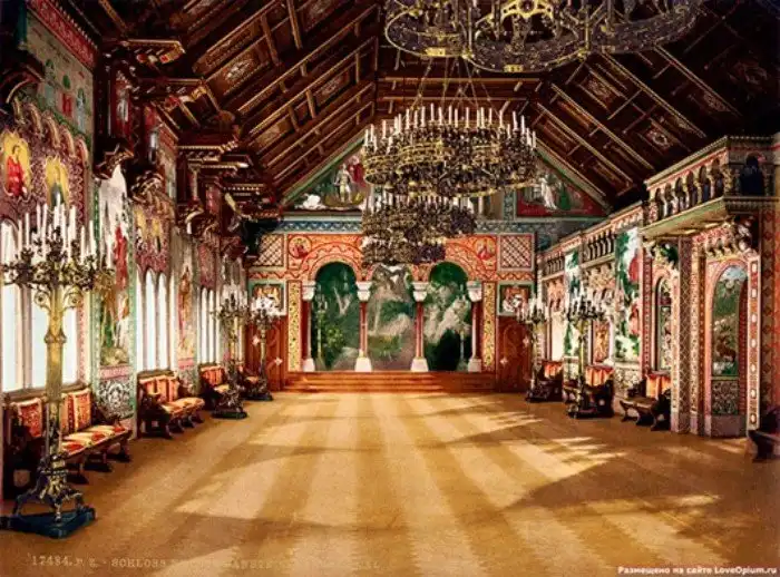 Внутреннее убранство замка являет собой смесь различных архитектурно-художественных стилей, сочетание мавританских, готических и барочных элементов: тут и колонны, и тронный зал. Интерьер большого зала в замке Нойшванштайн: