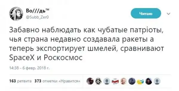 У Маска - частная компания, за Роскосмосом - Россия стоит, со всеми вытекающими льготами, дотациями, государственными контрактами по охрененно завышенным ценам, прямыми финансовыми вливаниями.