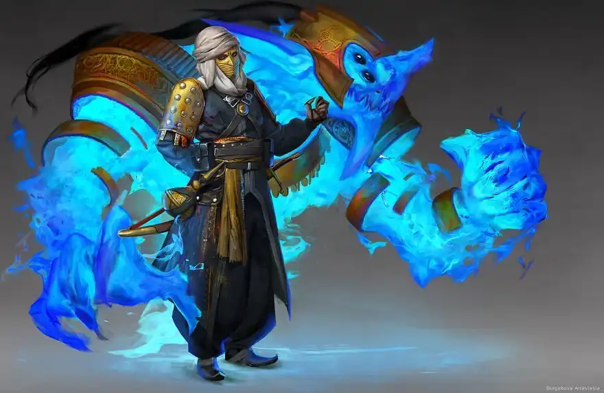 Первый персонаж в серии, относящийся к некой древней цивилизации. Я решила, что можно приписать его Ирану, потому что эта страна расположена там, где в течение веков находился крупнейший культурный центр Среднего Востока. Иран - маг. Он мрачен и неразговорчив, потому что разговоры ничего не стоят, в отличие от золота и власти. Этот герой находится на "серой стороне". Одет в арабском стиле, с элементами золотой амуниции. Использует золотую маску, чтобы прятать лицо и запугивать своих противников. У него есть волшебная лампа с джинном, исполняющим его желания. Не то чтобы у джинна был другой выбор. В битвах Иран использует в основном магию и дипломатическое давление. Изогнутая сабля применяется главным образом для казней, так как джинн делает почти всю грязную работу. Иран - определенно Властелин Песков. Многие с этим, конечно, не соглашались, и теперь их останки лежат где-то в пустыне. Джинн состоит из синего пламени, напоминающего жидкость. Он разумен и одет в древнюю броню, которая сегодня почти вся сломана. Обычно он появляется из лампы, чтобы защитить своего хозяина, и говорит на странном языке. Это типичный дуэт мага и духа.