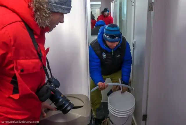 Душ тоже хитрый. Горячая вода - по расписанию - утром и вечером. Вода - кипяток, поэтому процедура следующая: вы набираете ведро с кипятком, потом выходите на улицу и накидываете в ведро снега, чтобы она стала просто теплой, после этого идете в душ, вставляете шланг в ведро и включаете насос. Ведра хватает минуты на две, так что мыться надо очень быстро.