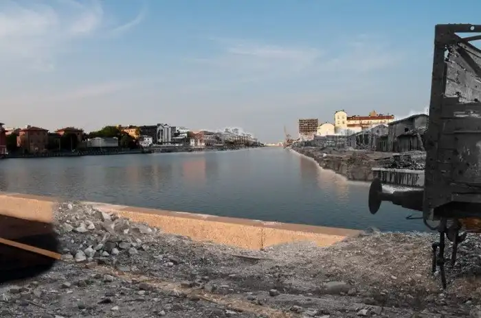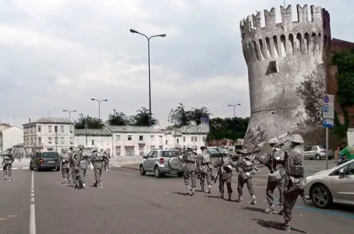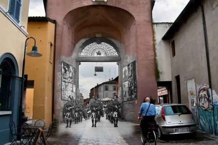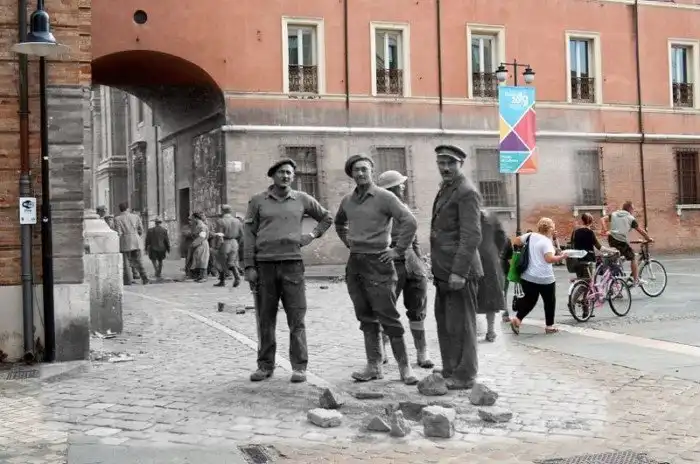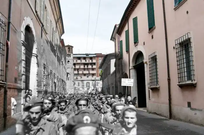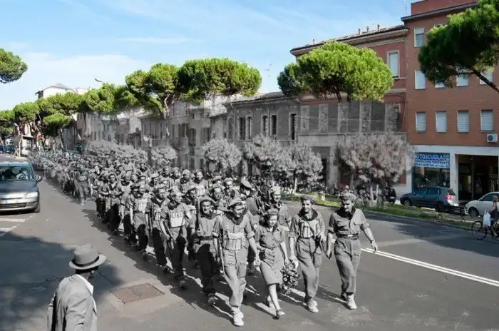 В 1944 году союзнические войска вошли в итальянскую Равенну. Власти фашистского правительства в городе был положен конец. Спустя семь десятилетий житель Равенны, фотограф и графический дизайнер Клаудио Ноттюрни решил увековечить освобождение родного города от фашистов в серии коллажей, в которых герои Второй мировой предстают в декорациях современной Равенны.