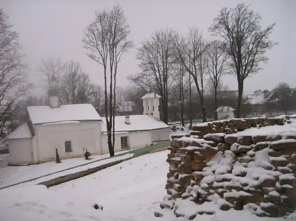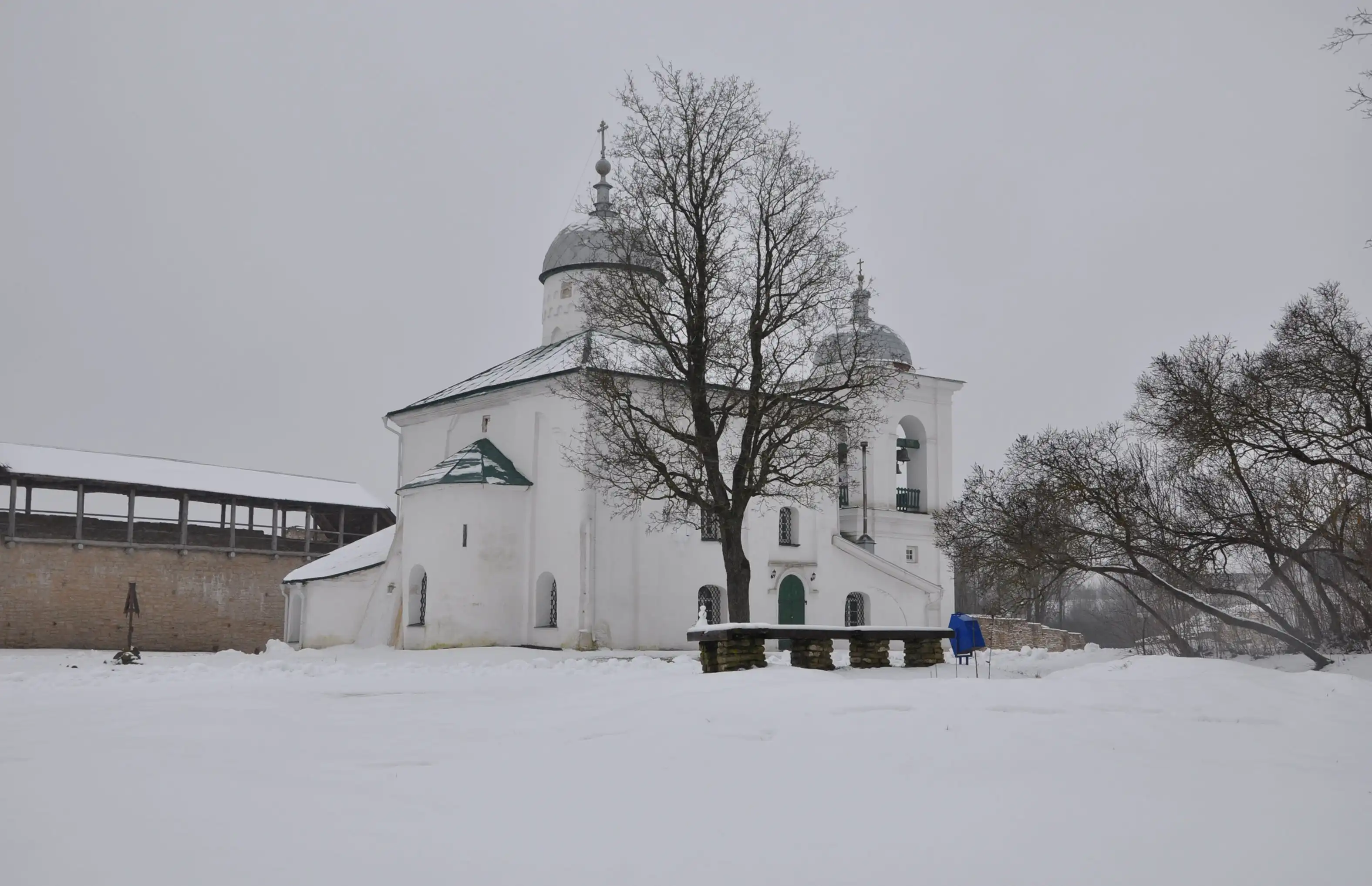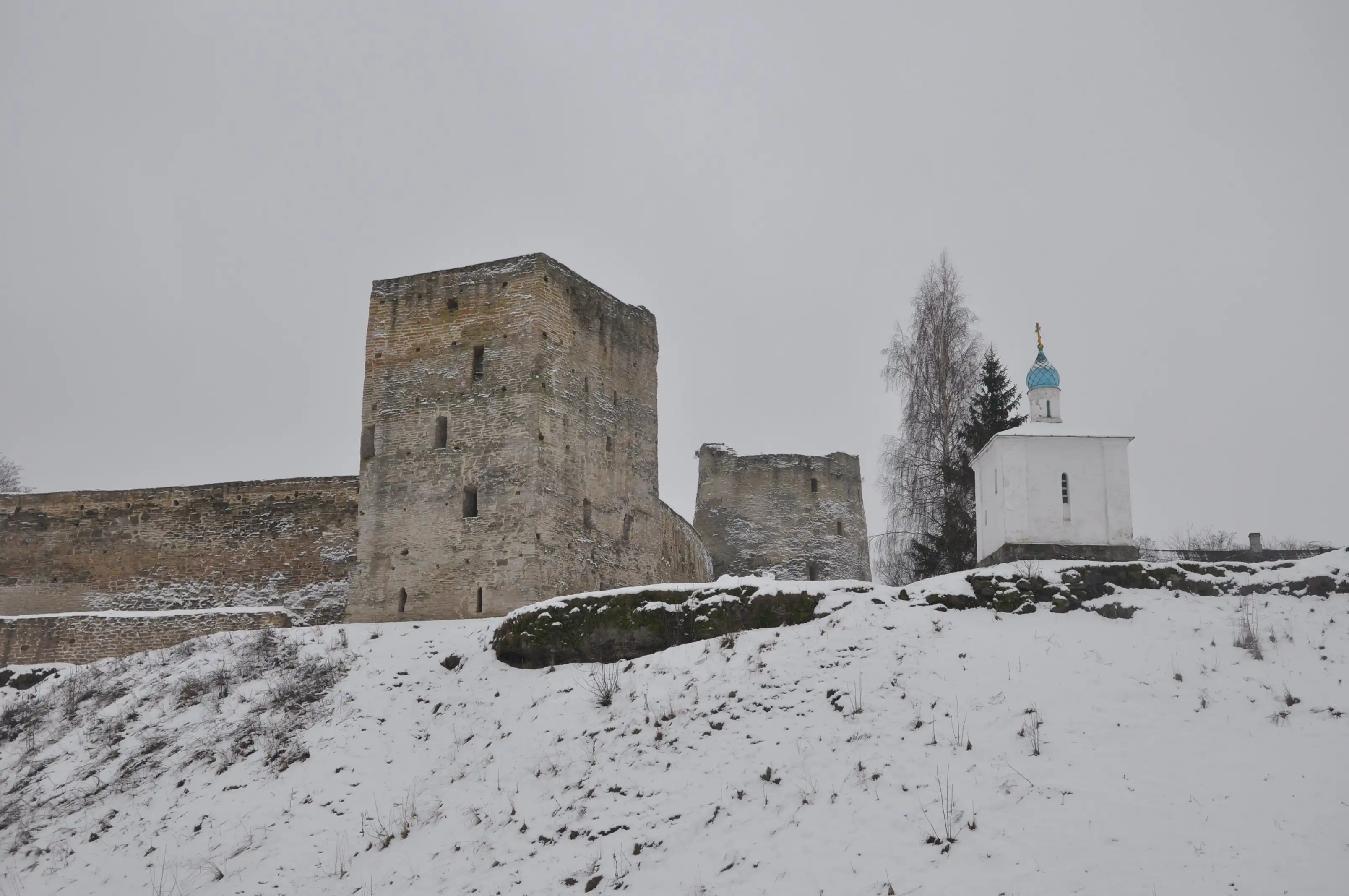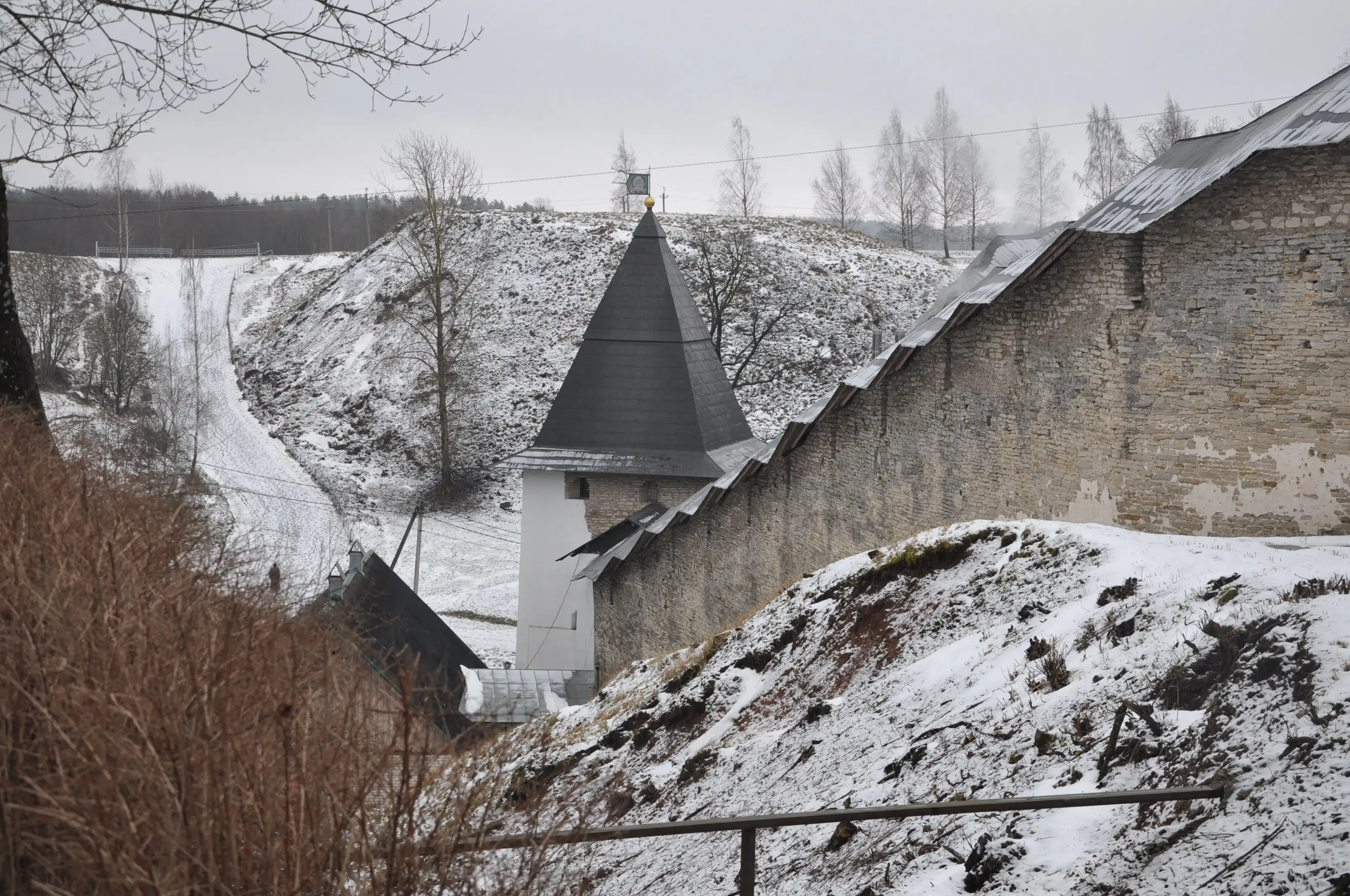 Кусочек Плоской башни и вид на церковь Сергия и Никандра. Храм в честь двух святых – заступника Москвы Сергия Радонежского и пустынника Никандра Псковского изначально был деревянным, и возвели его внутри Изборской крепости сразу после присоединения Пскова к Москве. Во время одного из пожаров деревянная крепость сгорела. Когда храм восстанавливали в камне, его установили уже вне крепостных стен.