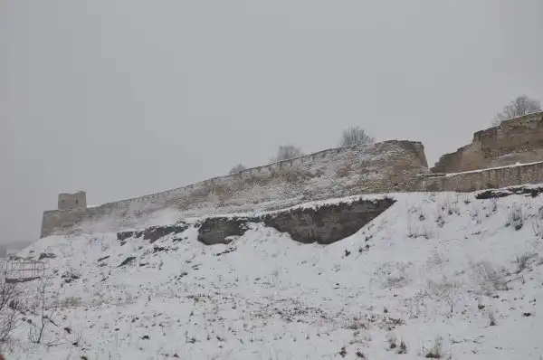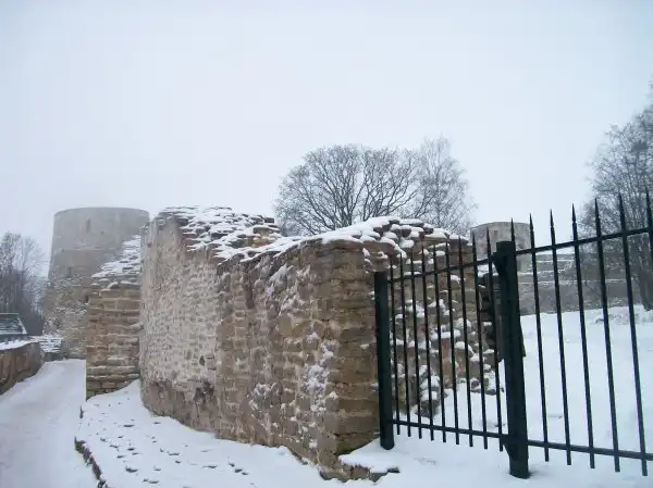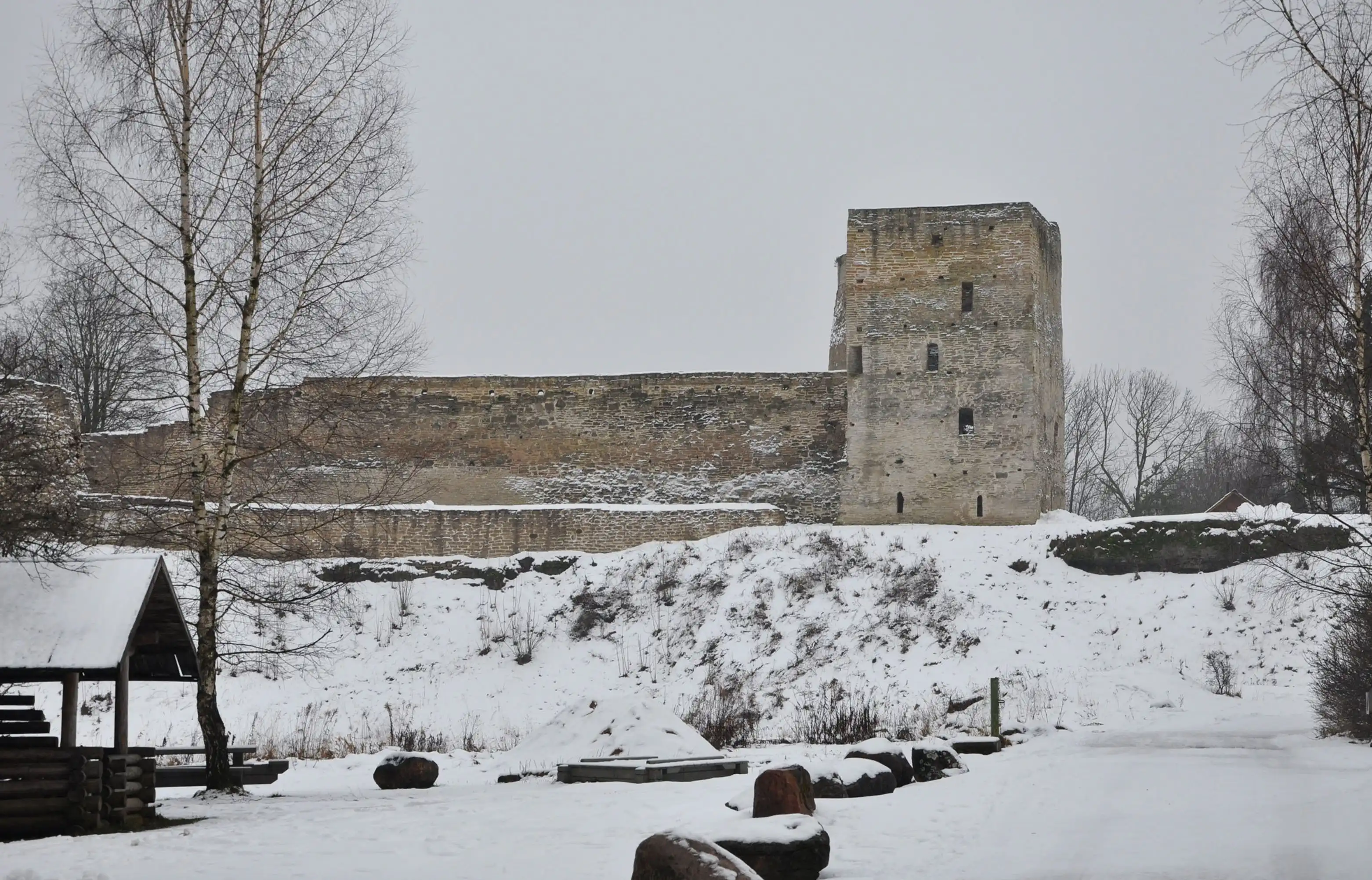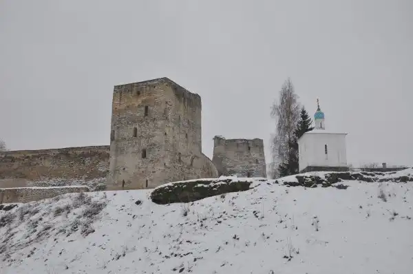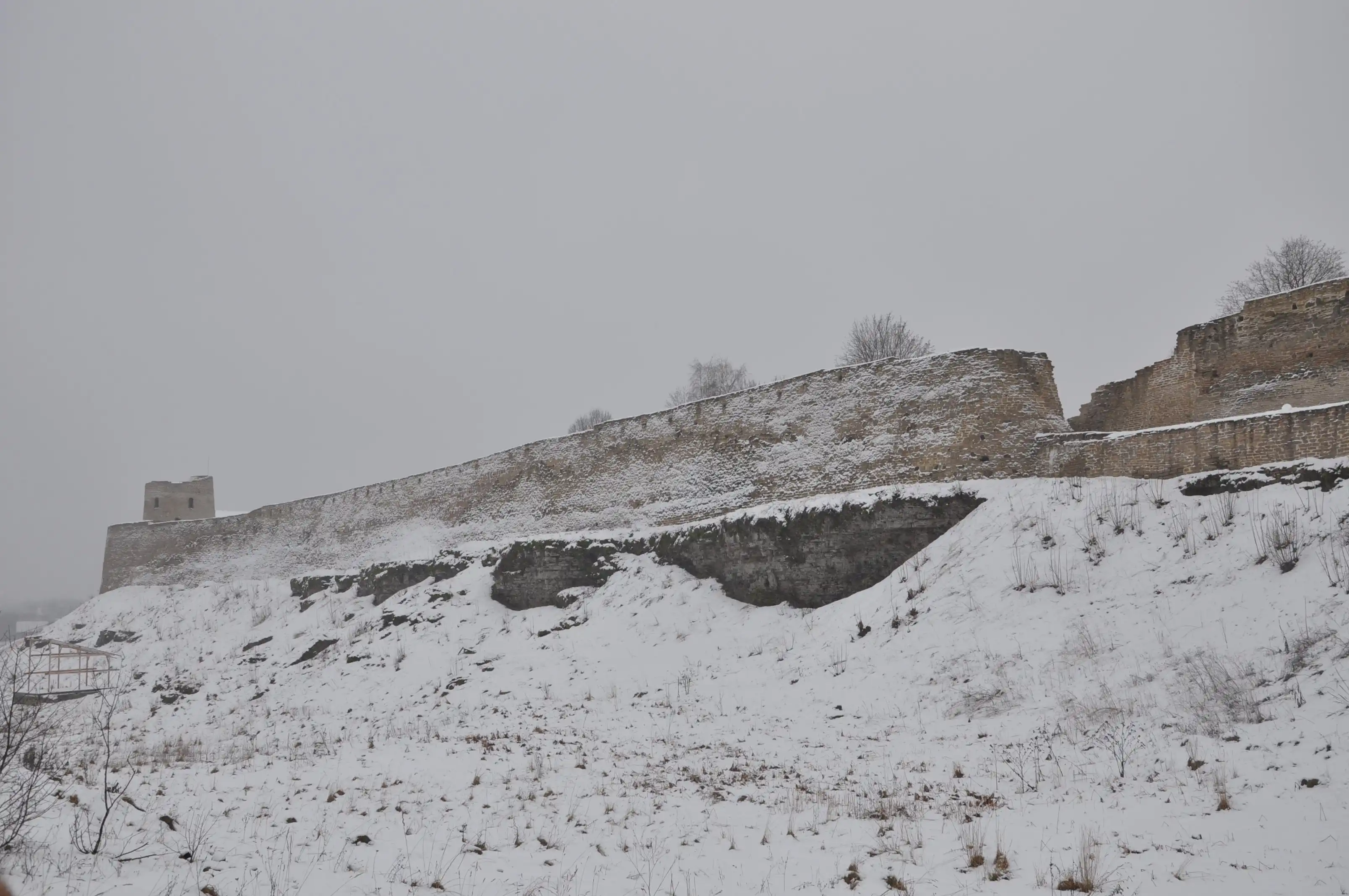Мы стоим у подножия скалы, из которой выросла Изборская крепость. Выросла не в переносном, а в прямом смысле слова: древние строители вгрызались в скалу, делая её более отвесной, рыли и углубляли рвы, а из вынутого таким образом камня возводили неприступные стены. Башни Изборской крепости не все одинаковой формы: среди сохранившихся шести башен – одна прямоугольная в плане, остальные – круглые. Причины такой разницы сокрыты во мраке веков: то ли назначение у башен было разное, то ли строили их в разное время. Действительно, Изборская крепость вставала на пути у Тевтонских и Ливонских рыцарей, которые двигались в сторону Пскова, начиная с XI и заканчивая XV веком, и её укреплённые башни выдерживали даже натиск средневековой артиллерии.