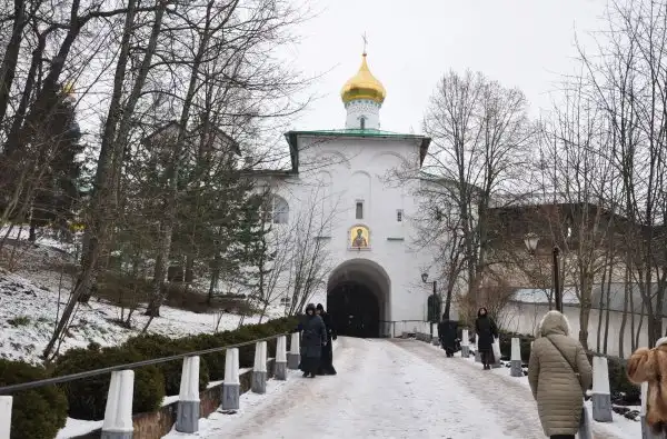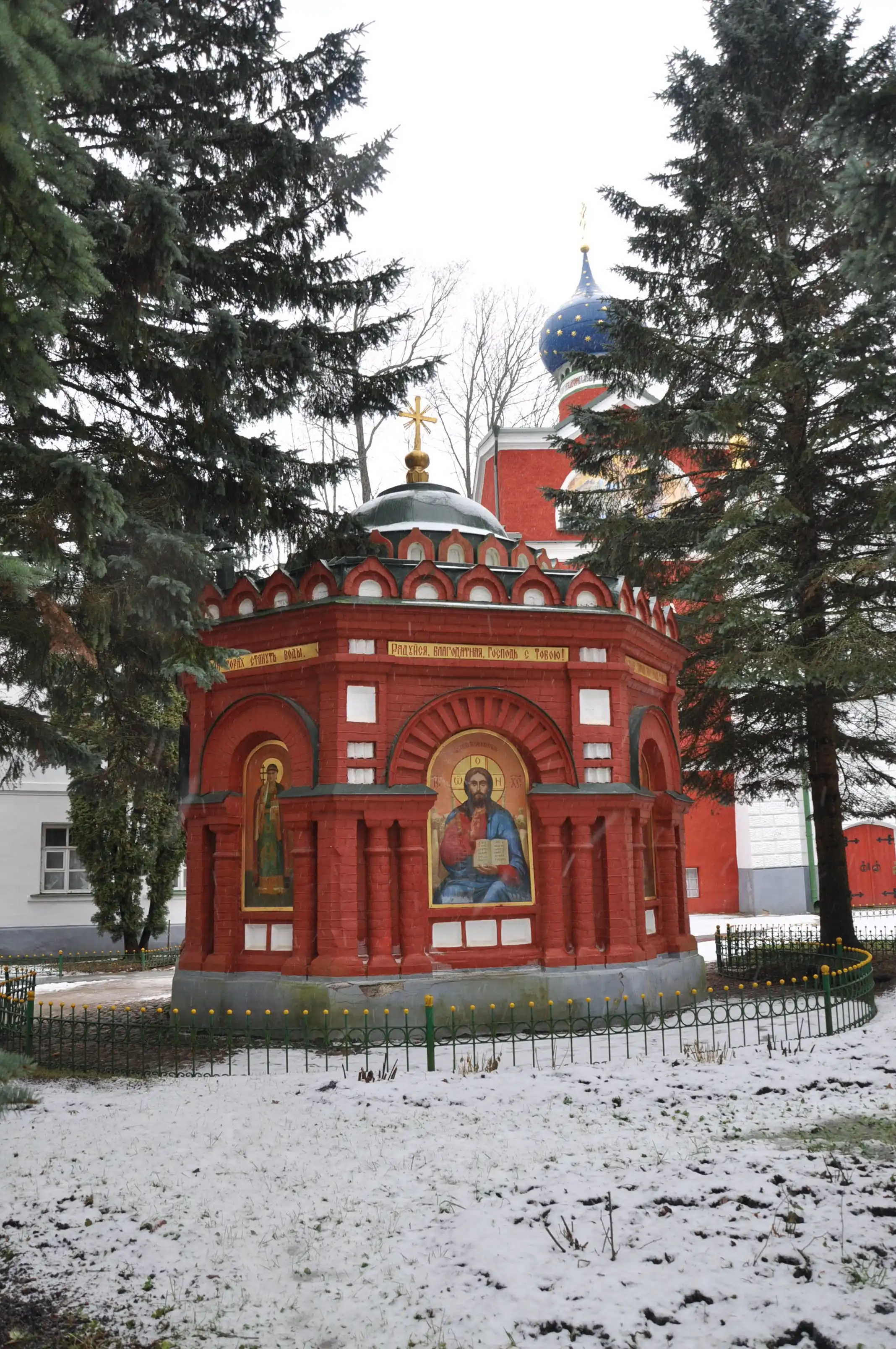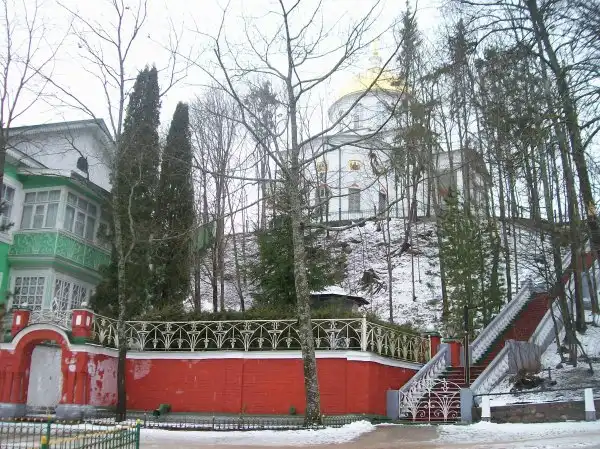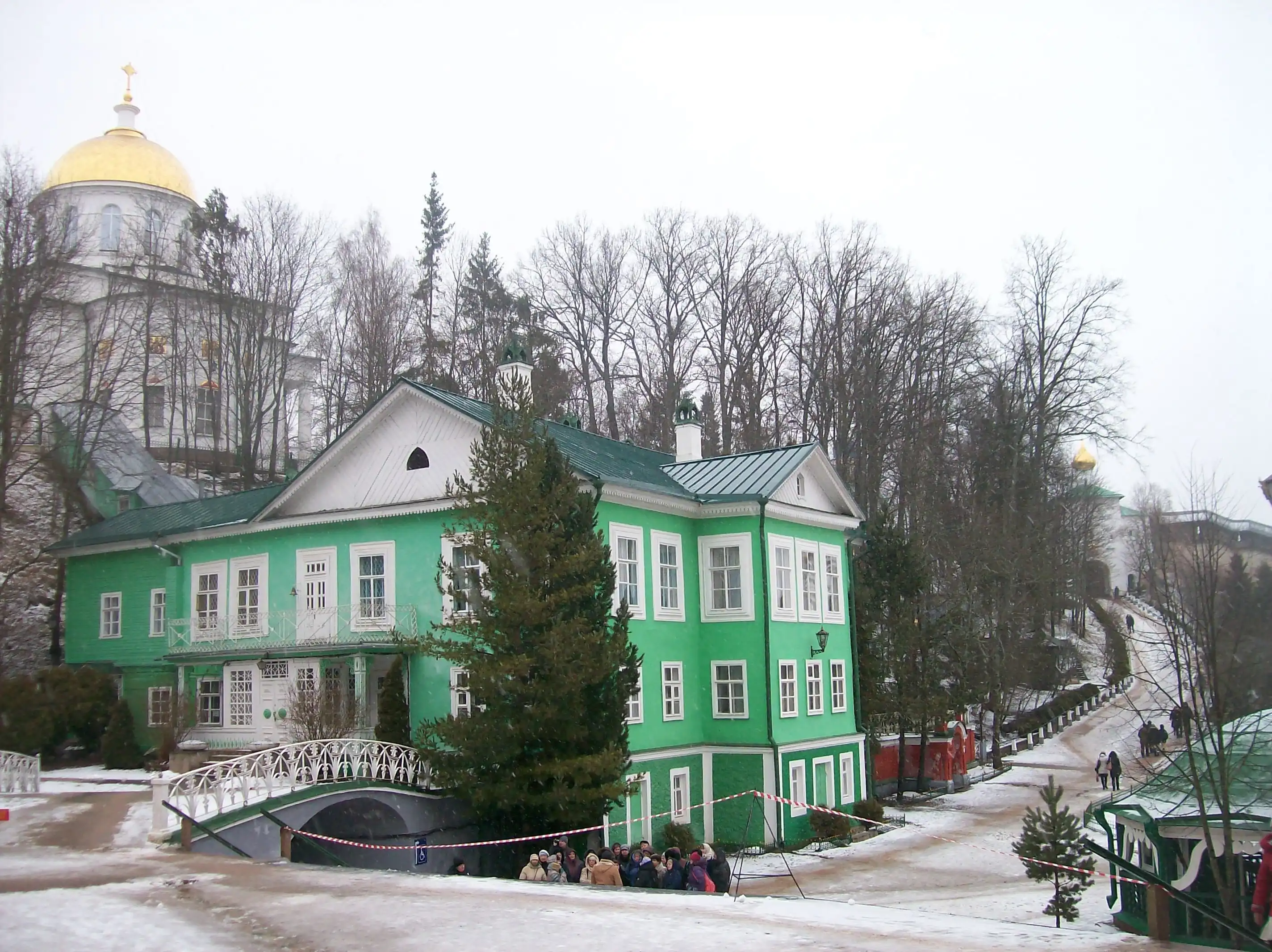 Монастырская ризница, или Большая казна . При игумене Корнилии она размещалась в подклете Благовещенской церкви, а теперь расположена в современном отдельном трёхярусном здании, выстроенном в едином стиле с надкладезной часовней. На трёх этажах здания ризницы расположены склад, библиотека и собственно ризница, то есть сокровищница Псково-Печерского монастыря, где хранятся золотые и серебряные кресты, драгоценные оклады и ризы, плащаницы, облачения, золотая и серебряная церковная утварь, подарки русских царей и императоров монастырю. Звучит соблазнительно, будто про сокровища алмазного фонда. Но нас туда не водили – то ли лимит времени не позволил, то ли ризница вообще закрыта для экскурсионного посещения. Полюбовались снаружи.