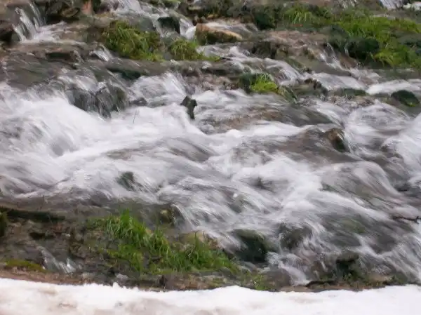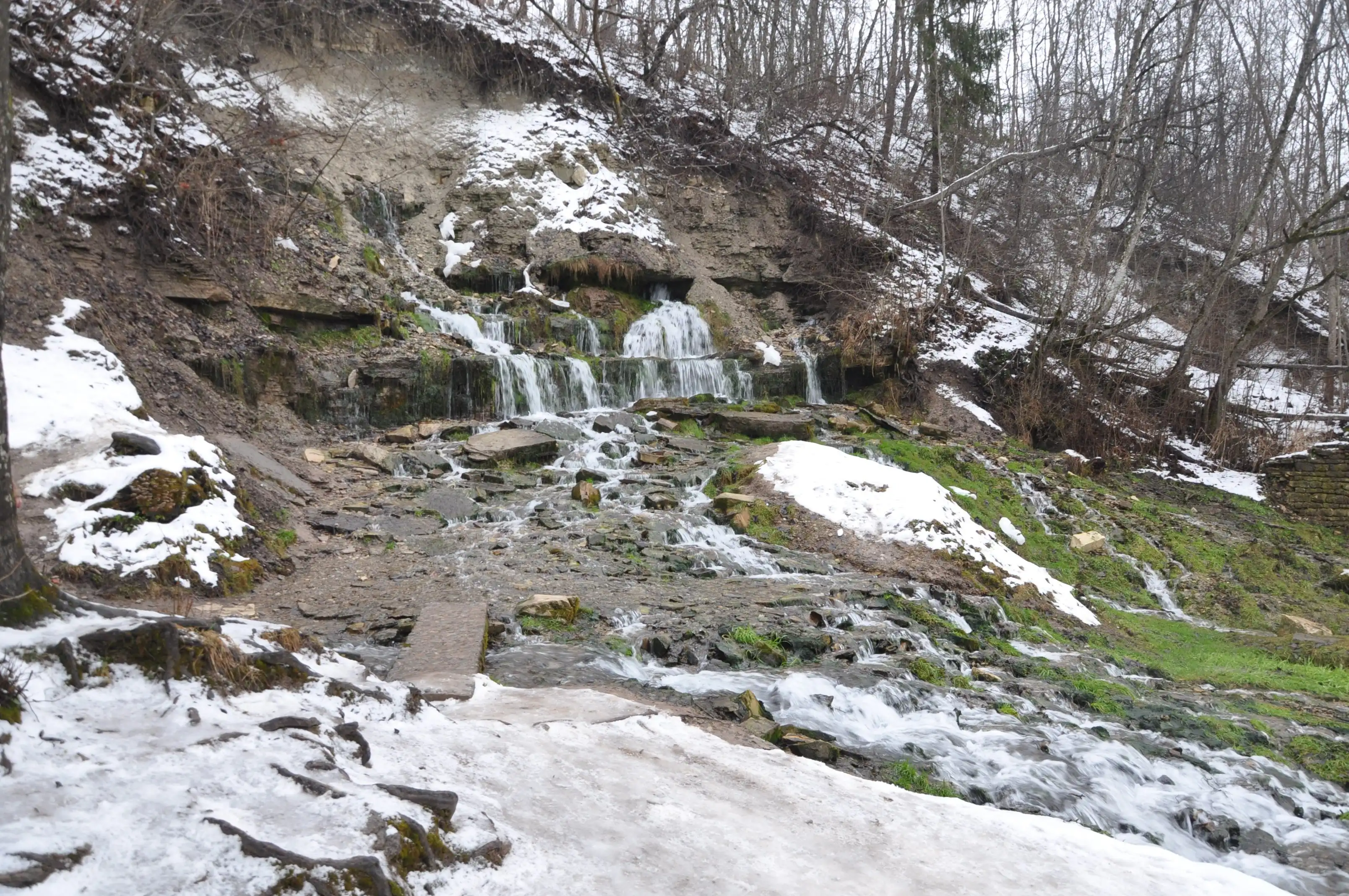 Словенские ключи являют собой зрелище совершенно фантастическое: из почти отвесной стены под напором бьёт вода, ручейки сливаются в бурный поток, кругом сугробы, крутой спуск к озеру весь заледенел, а у подножия водопадов – буйная зелёная трава, ближе к воде – живописные развалины водяной мельницы постройки XIX века. Словенские ключи напомнили мне бурные водопады Пшады в окрестностях Геленджика.