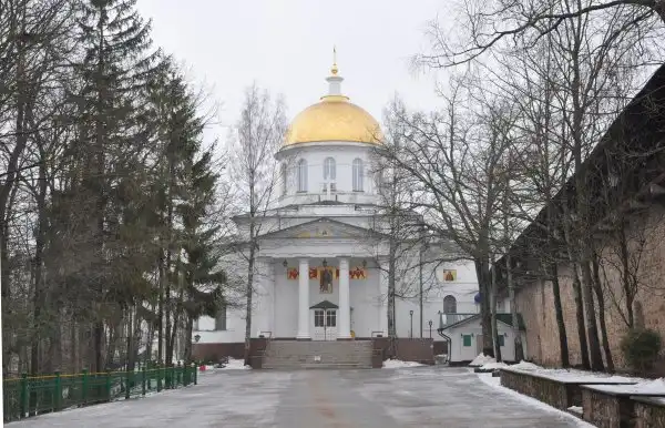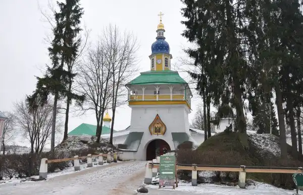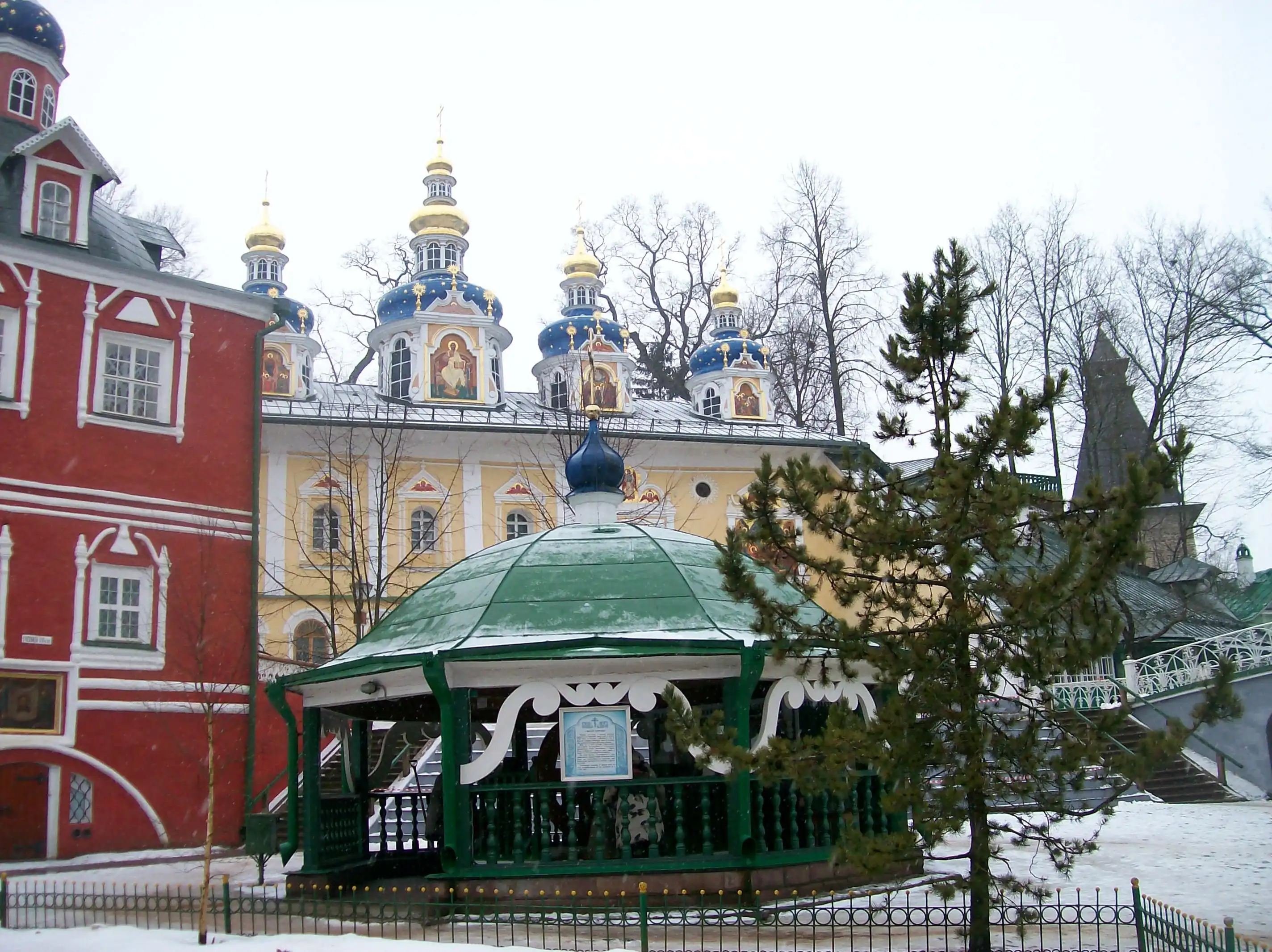 На переднем плане перед Успенским собором, оформленным в стиле украинского барокко (чтобы подчеркнуть связь с Киево-Печерской лаврой) мы видим зелёный шатёр, или сень, установленную над живоносным источником. Этот колодец играл огромную роль для всего монастыря во время многочисленных осад, снабжая защитников крепости водой. Сегодня, чтобы добыть святую воду, надо потрудиться: в источнике нет электрического насоса, всё на ручной тяге – для подъема воды установлена старинная железная колонка, какие были раньше на улицах в маленьких уездных городах.