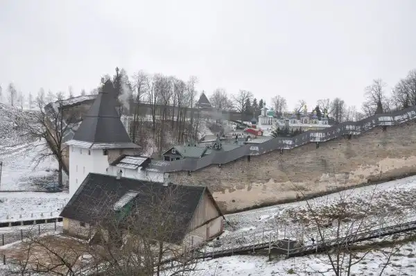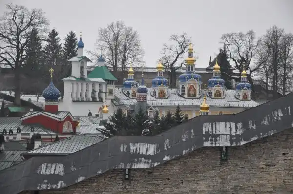 Когда обозреваешь ансамбль монастыря со смотровой площадки, он производит довольно странное впечатление. Во-первых, в отличие от большинства православных обителей и крепостей, он расположен не на горе, а в глубоком овраге, на дне которого протекает ручей Каменец. Мощные укреплённые стены ступенями спускаются по уступам Святой горы, защищая монастырские постройки. Во-вторых, многочисленные яркие здания внутри серых крепостных стен, относящиеся к разным эпохам и к разным архитектурным стилям, кажутся эклектическим и бессистемным нагромождением построек. И лишь попадая внутрь и обозревая ансамбль монастыря со дна оврага, понимаешь, насколько он гармоничен и прекрасен. Псково-Печерскому монастырю вообще присущ некий дуализм: вроде монастырь, но в то же время мощная оборонная крепость, вроде храмы, зовущие ввысь, но частично их помещения располагаются в подземных пещерах Святой горы. Собственно, по этим пещерам монастырь и называется Печерским, то есть пещерным. Даже монастырское кладбище здесь необычное: гробы с покойниками не зарывают, а как бы складируют один на другой в пещерах монастыря. Микроклимат в них такой, что разложения и сопутствующих ему запахов практически нет, но незаметный процесс тления всё-таки идёт, иногда стоящие внизу гробы просто рассыпаются в прах, а установленные на них сверху с грохотом проседают вниз, чтобы дать место другим, новым захоронениям.