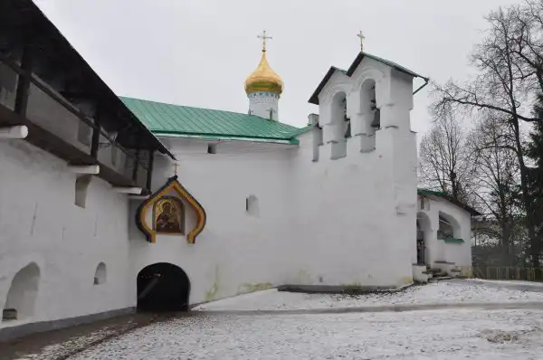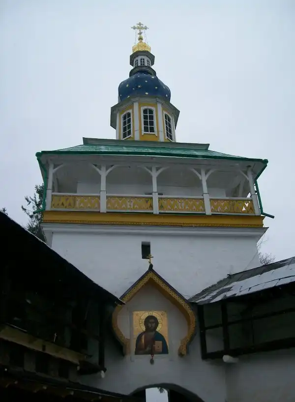 Малая звонница Псково-Печерского монастыря. Эта изящная звонница с асимметричным крыльцом была пристроена в 1581 г. к церкви Николы Ратного, выстроенной в 1565 г. и какое-то время , до постройки Башни Святых Ворот, служившей главным входом в монастырь.