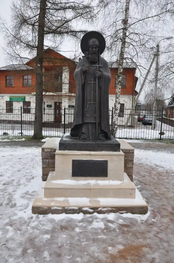 В 1529 г. игуменом монастыря стал монах Корнилий. Эта небольшая скромная статуя, едва ли высотой в человеческий рост, установлена перед монастырём в его честь. С игуменом Корнилием связан настоящий расцвет обители: число монастырской братии при нём выросло с 12 до 100 человек, была построена трапезная церковь во имя Благовещения Пресвятой Богородицы, расширена Успенская церковь, прокопаны вглубь и расширены монастырские пещеры, была создана иконописная мастерская, составлен летописный свод - Псковская третья летопись. Именно при нём обитель превратилась в сильную крепость, но игумен Корнилий поплатился за это в буквальном смысле слова головой и стал преподобномучеником. Легенда гласит, что во время похода на Ригу где-то около 1558 гг. царь Иван Грозный проезжал через Псков и Печоры и заехал в гости к игумену монастыря. Тот посетовал, что монастырь его разоряют ливонцы и испросил разрешения возвести вокруг него каменную стену. Недоверчивый и подозрительный московский царь испугался, что новый форпост может быть с большой вероятностью использован против него, и пошутил, что разрешает построить монастырю каменную ограду, но не больше воловьей шкуры. Хитроумный Корнилий велел своим монахам взять воловью шкуру и разрезать её на тонкие ремни, соединить эти ремни в длинную кожаную полосу, и согласно длине этой полосы выстроить стену монастыря. Ремней из воловьей шкуры хватило на 800 метров монастырских стен. Возвращаясь из похода Иван Грозный вновь проходил через Печоры, увидел каменный монастырь и заподозрил игумена Корнилия в измене. В гневе он снёс ему голову своей острой саблей. Но, якобы, когда Грозный отрубил Корнилию голову, то тут же раскаялся в содеянном преступлении, поднял обезглавленное тело праведника и медленно понес его к главному храму монастыря, к Успенскому собору. Кровь с бездыханного тела капала на землю. С тех пор дорога от Никольских ворот монастыря, где встречал Корнилий царя, до Успенского собора называется Кровавой. Летом, во время церковных праздников, она бывает украшена пёстрым ковром из живых цветов.