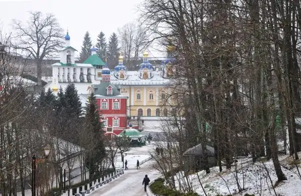 А вот так выглядит обитель изнутри, если смотреть на неё, спускаясь по Кровавому Пути Ивана Грозного от Никольских ворот к Успенскому храму. Она производит нарядное, мирное и светлое впечатление. Многие паломники сравнивают её с воплощением рая на земле. То, что основные постройки находятся в котловине ниже уровня окружающего ландшафта, даёт удивительное чувство защищённости от перипетий жестокого мира, оставшегося вовне за монастырской стеной. Кстати, обратите внимание: внизу справа от дороги торчит серенькая крыша то ли навеса, то ли киоска. Это стеклянный павильон (к сожалению, окна залеплены снегом и вообще давно не мыты) в котором хранится карета императрицы Анны Иоанновны. Она часто приезжала сюда замаливать многочисленные грехи , когда ездила навещать свои курляндские владения, но однажды она так заторопилась по государственным делам, что решила проехать мимо монастыря, не заезжая в него. Не тут-то было! Вдруг разразилась сильнейшая буря, и императрице пришлось –таки скрываться от непогоды в монастыре. В память об этом назидательном событии она принесла Псково-Печерской лавре в дар свою парадную карету.