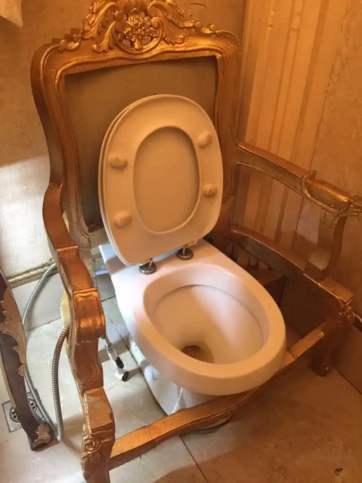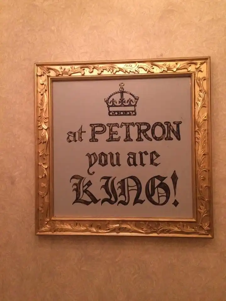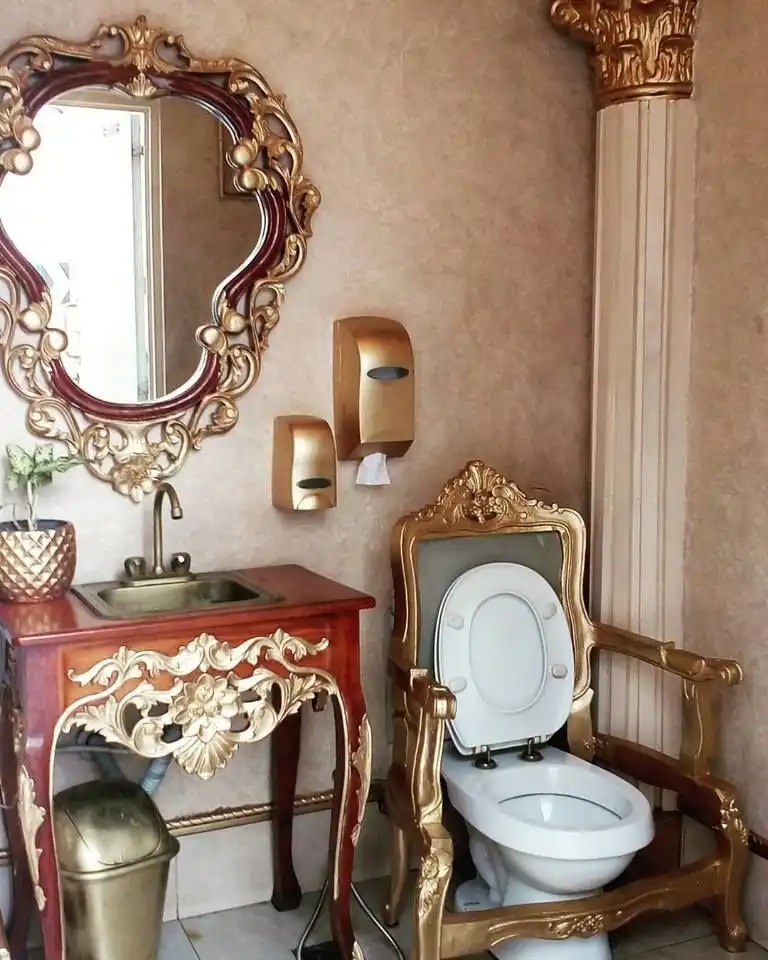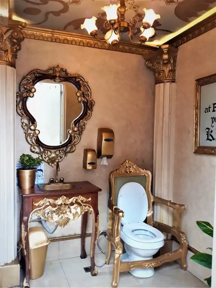 В уборной есть деревянный трон вокруг унитаза, настенные и потолочные украшения, большое зеркало в богатой раме, люстра и табличка на стене с надписью "В Петроне вы король!".