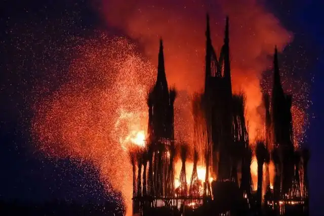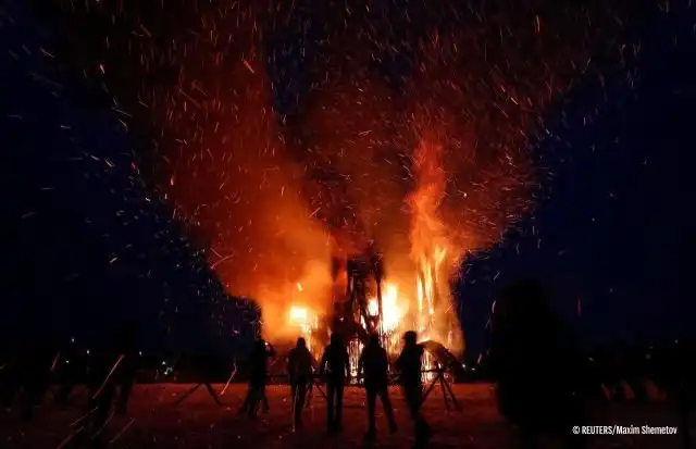 Никто так не любит Масленицу, как жители деревни Никола-Ленивец Калужской области. Под руководством местного художника Николая Полисского был возведен деревянный костел, который после феерично подожгли. Это вам не чучело в тряпье сжечь…