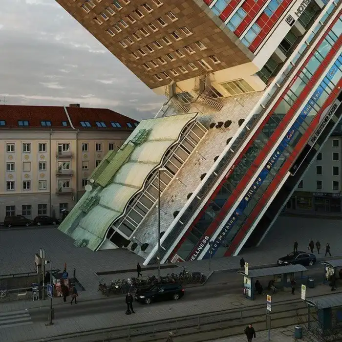 Виктор Энрич гнет, сгибает, подбрасывает в воздух, заваливает на бок и перекручивает бедные-несчастные здания. "Издевается" над ними как хочет