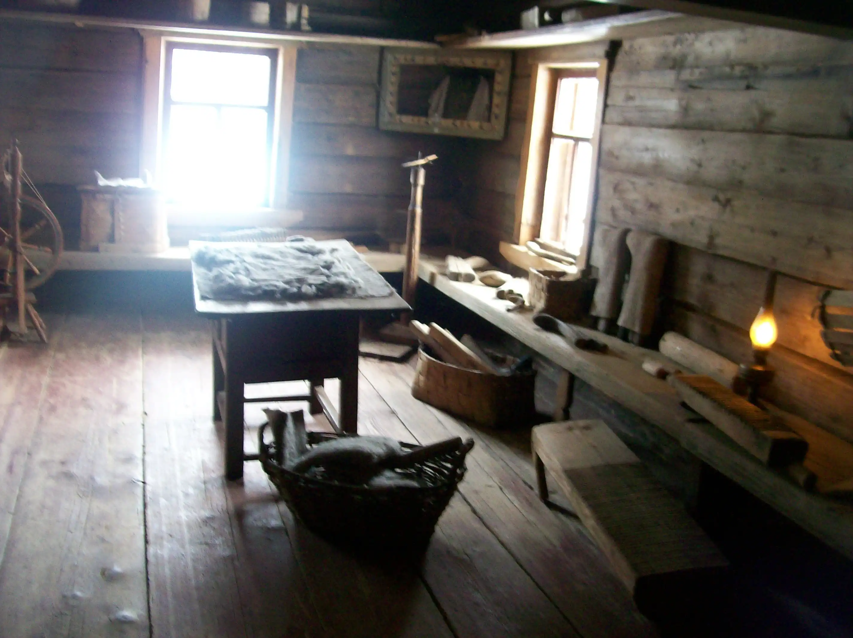 Жители новгородских деревень занимались различными ремёслами – например, изготовлением валенок. Здесь мы видим чесальную машину для шерсти и всякие приспособления для валяния.