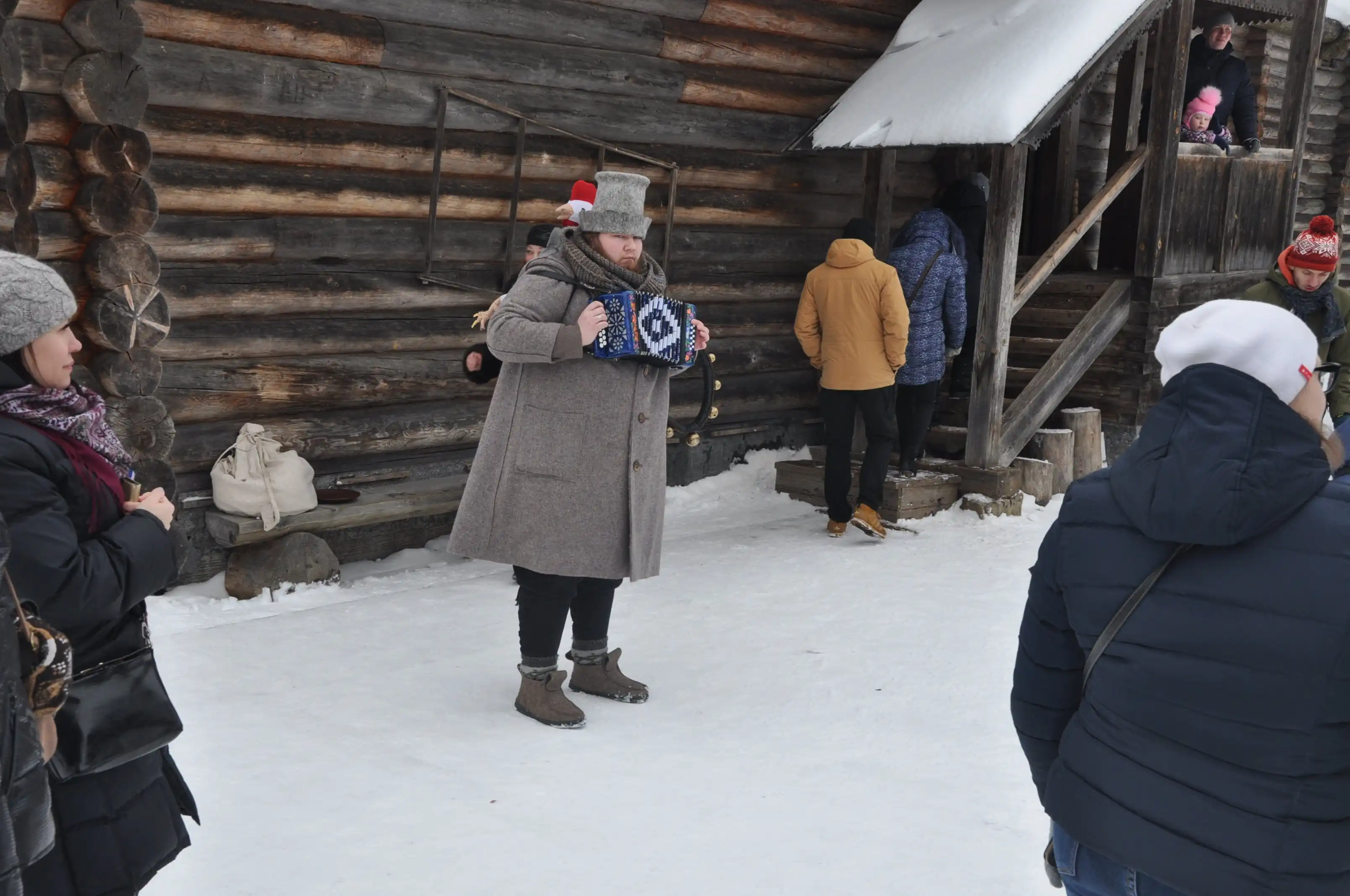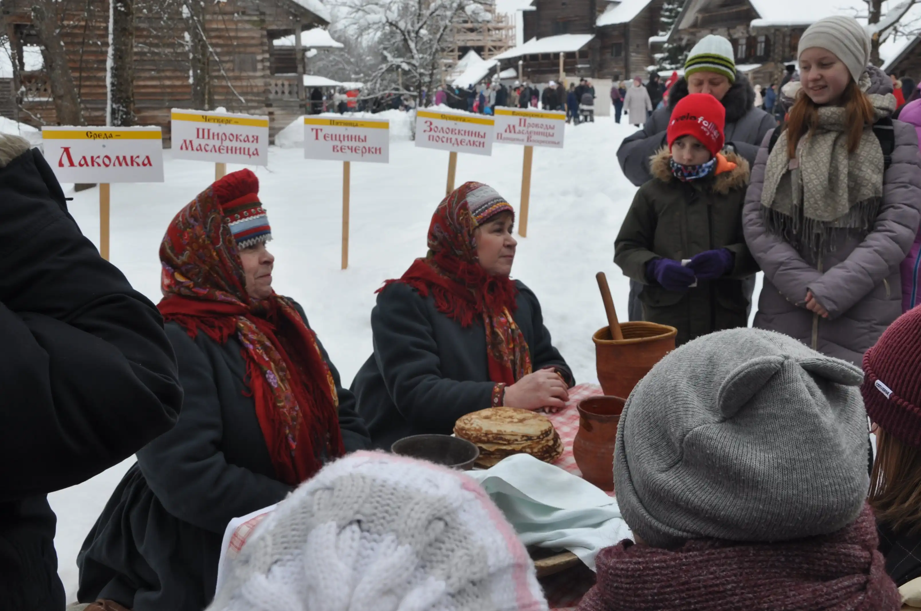 Вход в музей недешев – 350 рублей с человека, тем не менее на Масленицу здесь собралась такая толпа посетителей, что не пробиться. Для организации фольклорных мероприятий мобилизованы все, как один, работники музея – например, кумушка на раздаче блинов, которая сидит слева и увлечённо местным колоритным говорком, рассказывает детям о масленичных обычаях – наш экскурсовод, старший научный сотрудник музея в звании профессора.
