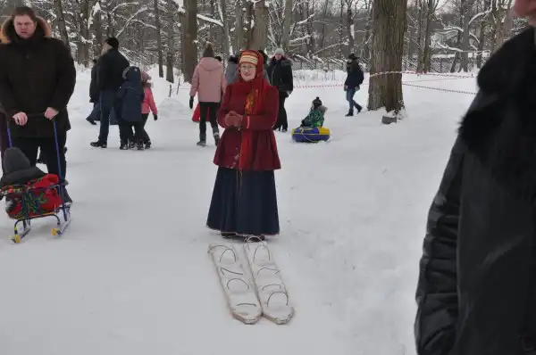 Зато по дороге мы вдоволь насмотрелись на всякие народные забавы и развлечения: дородный парень (определили по густой бороде) играет на гармошке, а в заплечном ранце у него – муляж петуха, девочки соревнуются в подкидывании лепёшек в воздух и ловят их обратно на сковородочку, пацаны развлекаются стрельбой из лука по мишеням, кто-то катается с высокой ледяной горки.