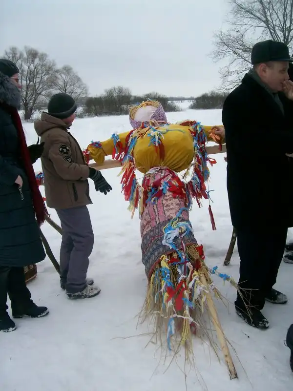 Чучело Масленицы. Оно всё увешано разноцветными ленточками, и это не для красоты. Чучело Масленицы торжественно сжигалось по окончании праздника на пустыре за деревней, а вместе с ним сгорали в костре все беды и невзгоды, который каждый нашептывл, привязывая к чучелу свою персональную ленточку. Сожжение Масленицы – это проводы зимы, которая как соломенная кукла от языков костра сгорает от лучей горячего весеннего солнца. Золу от сгоревшей Масленицы собирали для удобрения огородов. Да и блин в древнеславянской традиции символизирует солнце. Прощёное воскресенье подходит к концу. Со следующего дня начинается Великий Пост, за которым придёт Пасха и настоящая весна. Прощай, Масленица! До свидания, Витославлицы! Мы узнали и увидели своими глазами много нового и интересного. А блинов поедим в кафе!