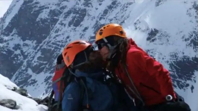 Альпинисты Рольф Баэ и Сесиль Ског целуются перед подъемом на гору Чогори. В тот же день Рольф погиб в снежной лавине.