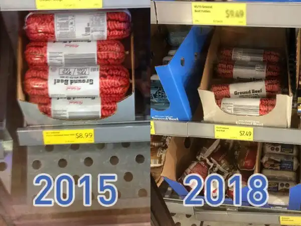 Фарш говяжий замороженный, был $8.99 за три фунта (около 1,3 кг), и подешевел до $7.99. -11%