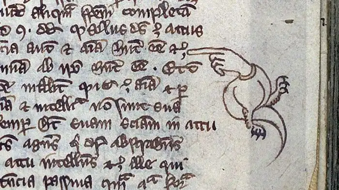 На полях средневековых книг, написанных на пергаменте, найдены интересные знаки в виде пальцев рук или целых фигур людей и животных с указующими перстами, тянущимися к определенной строке, иногда, нескольким. Первоначально можно подумать, что это старались художники-оформители книг, столь изящны и оригинальны эти изображения. Но, это всего лишь «заметки на полях» с целью отметить строку – понравившуюся или требующую запоминания и обсуждения.