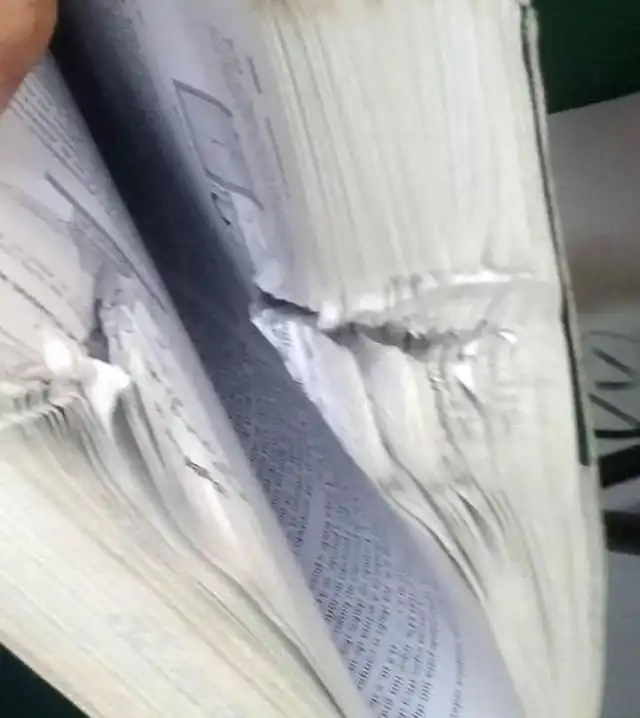 Возвращаясь с занятий, молодой человек оказался не в то время не в том месте. У центрального городского рынка началась перестрелка и все прохожие бросились врассыпную. Студент бежал без оглядки и даже не почувствовал, как в его рюкзак влетела пуля, выпущенная из пистолета 38 калибра. Три дня спустя парню понадобилась та самая книга, между страниц которой он и обнаружил застрявшую пулю. Сообщается, что в той перестрелке погибли три человека, но благодаря книге счастливый студент сумел избежать той же участи.