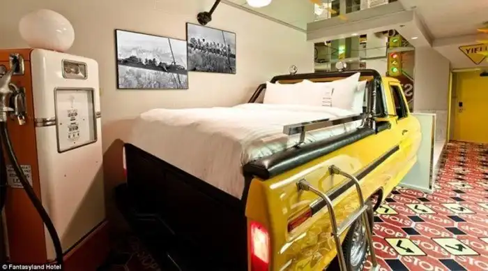 В номере в автомобильном стиле есть всё: и кровать в пикапе, и заправочная станция, и светофор