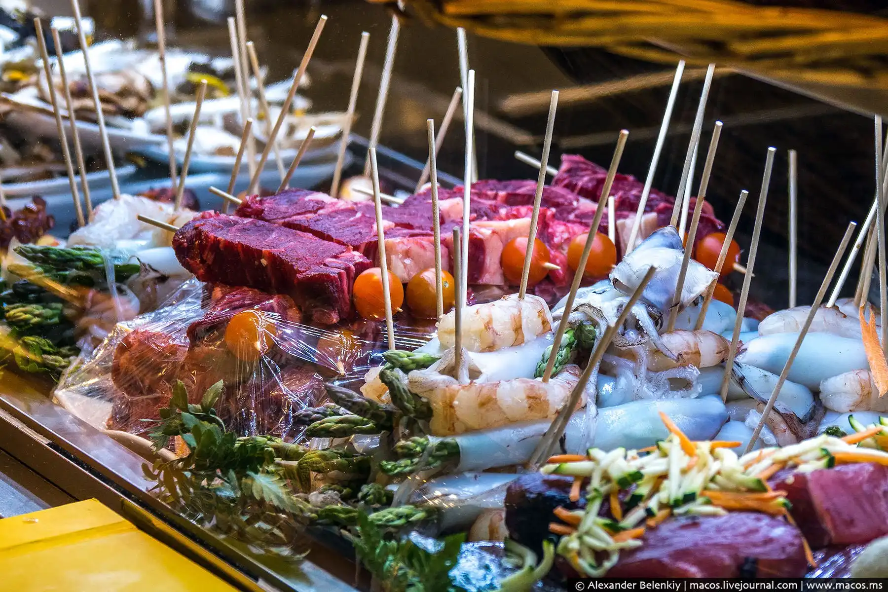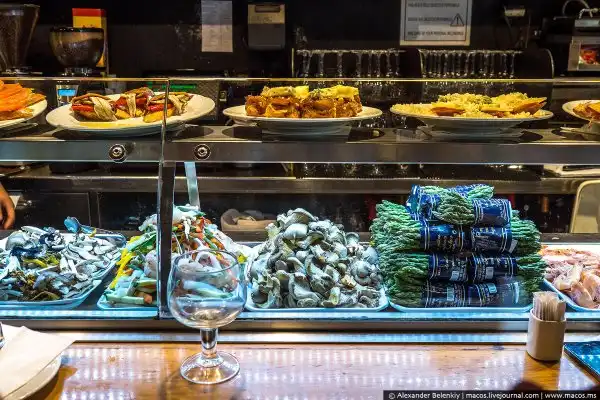 Что же такое тапасы? Изначально - закуски к пиву или вину: мясо, овощи, морепродукты. Часть закусок уже готова и ждёт на витрине своего едока, другие блюда нужно готовить. Но всё очень быстро: даже если вы ждали сорок минут, в следующие полчаса сможете наесться по-полной.