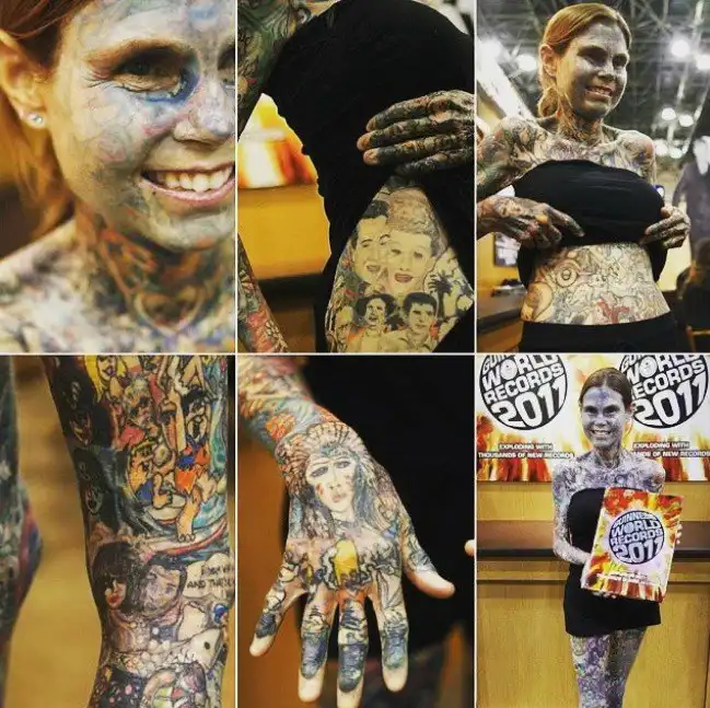 Более 96 % тела Джулии Гнусе было покрыто татуировками. Так женщина боролась с порфирией — болезнью, при которой солнечный свет вызывает на коже ожоги.