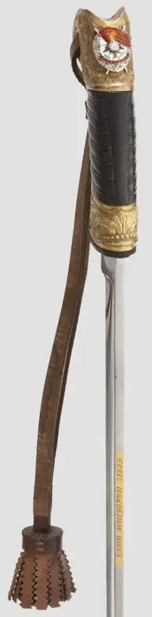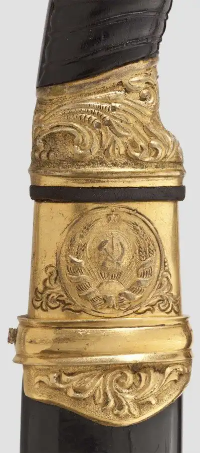 Редчайшая наградная шашка, 1932 года выпуска. Клинок однолезвийный, стальной, с легким изгибом (37 мм в максимальной точке), с одним очень широким долом на 3/4 длины клинка. На одной из голоменей, в доле клинка позолоченная надпись: "Доблестному бойцу Р.К.К.А. от Ц.И.К. С.С.С.Р.". На этой же стороне клинка нанесен позолоченный герб СССР, и цветочный узор. На коротком полностью позолоченном рикассо клеймо "ЗГЗ" и дата выпуска - "32 г.". На обухе клинка позолоченная надпись "Злат.Инструм.Завод". Металлические детали рукояти, богато украшены растительными орнаментами и выполнены из позолоченной латуни. На навершии миниатюра ордена "Боевого Красного Знамени", выполненная в полном соответствии со статутом ордена из серебра и эмали. Основная часть рукояти из лакированного черного дерева. Ножны из лакированного дерева. Устье, подвес и бутероль ножен из полностью позолоченной латуни. Устье украшено рельефным гербом СССР.