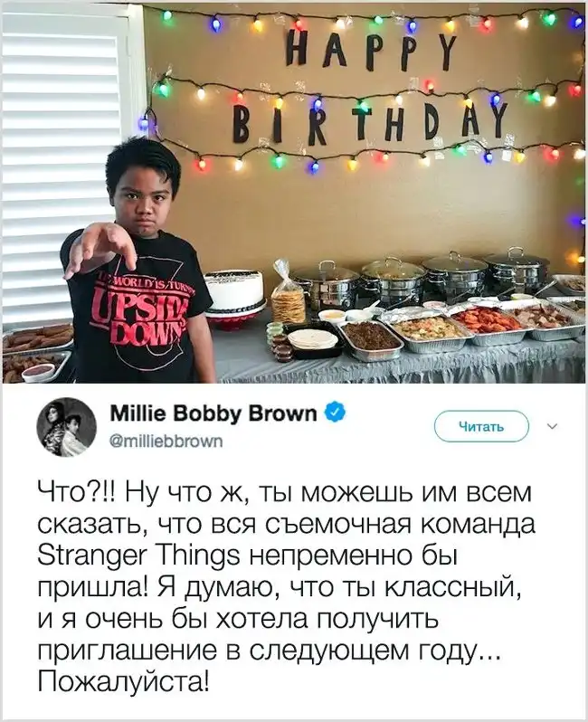 Когда юный фанат сериала «Очень странные дела» пригласил на свой тематический день рождения своих одноклассников, никто не пришел. Сестра Аарона поделилась этой грустной историей в твиттере, и неожиданно твит разлетелся по интернету, и тысячи людей стали поздравлять именинника. Парня удалось не просто утешить, но и сделать самым счастливым фанатом: исполнительница одной из главных ролей в сериале Милли Бобби Браун написала Аарону, что будет счастлива прийти на его праздник в следующем году.