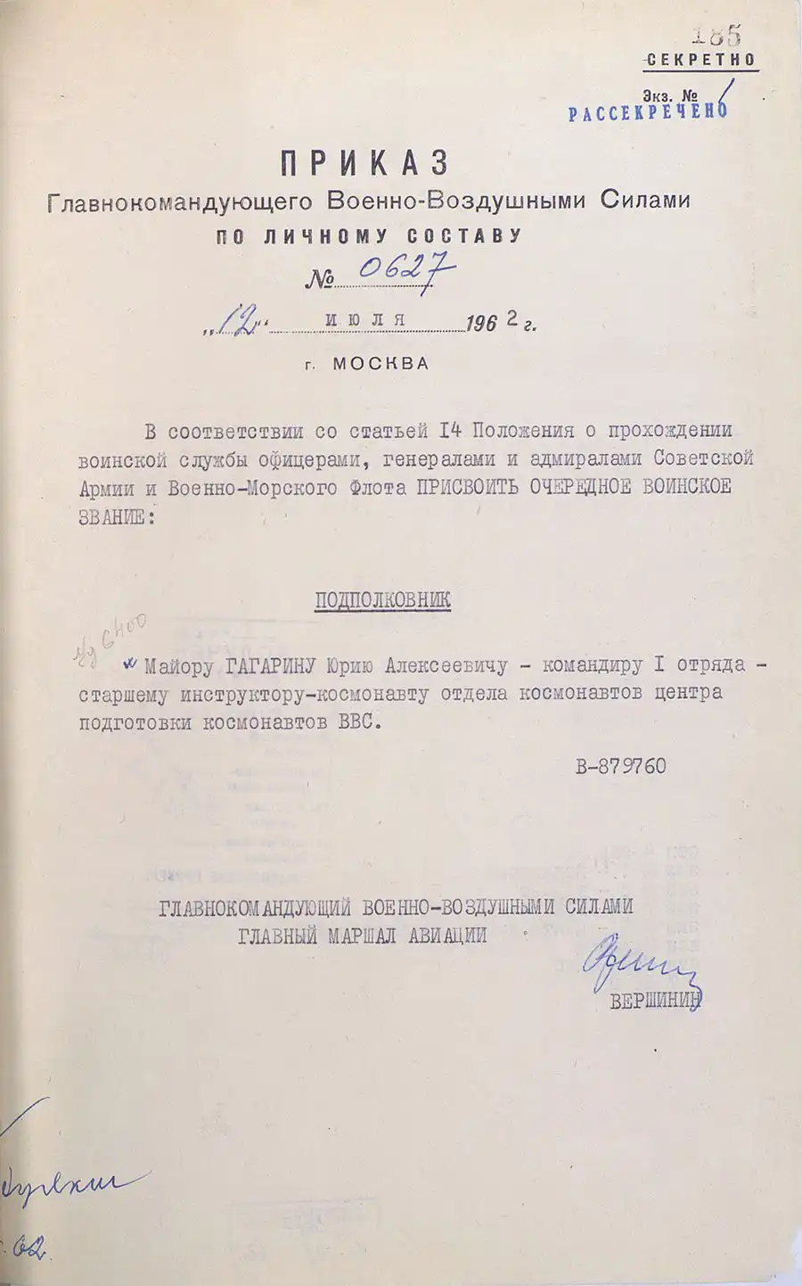 Министерство обороны России опубликовало уникальные архивные документы о службе первого космонавта, полковника Юрия Гагарина, начиная с момента присвоения ему первого офицерского звания в октябре 1957 года