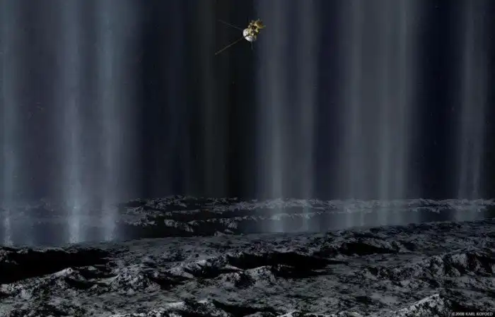 Концепт, демонстрирующий пролет орбитальной станции "Кассини" мимо луны Сатурна под названием Энцелад с целью изучения струй гейзеров, которые извергаются на поверхности луны в районе южного полярного региона