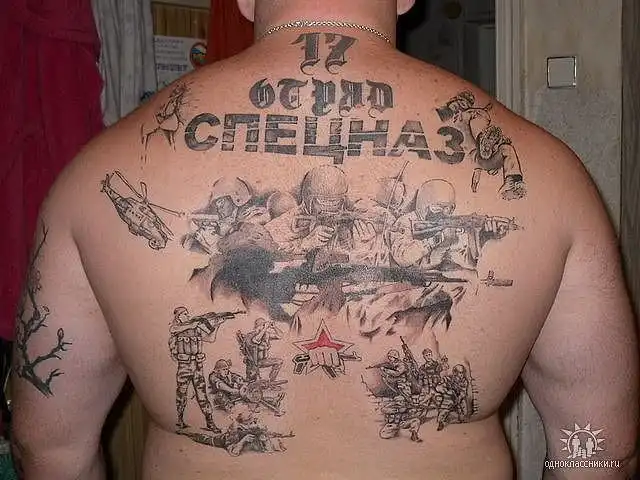 Военнослужащие российской армии в память о своей службе нередко решают набить себе татуировки. Рисунки этих татуировок могут быть самыми разными, что в первую очередь зависит от рода войск и подразделений. Далее предлагаем взглянуть на некоторые из подобных татуировок.
