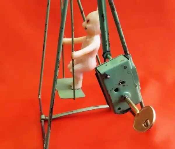 В СССР было немало заводных игрушек. Например, заяц на качелях от “Московского завода механической заводной игрушки”, конец 1950-х