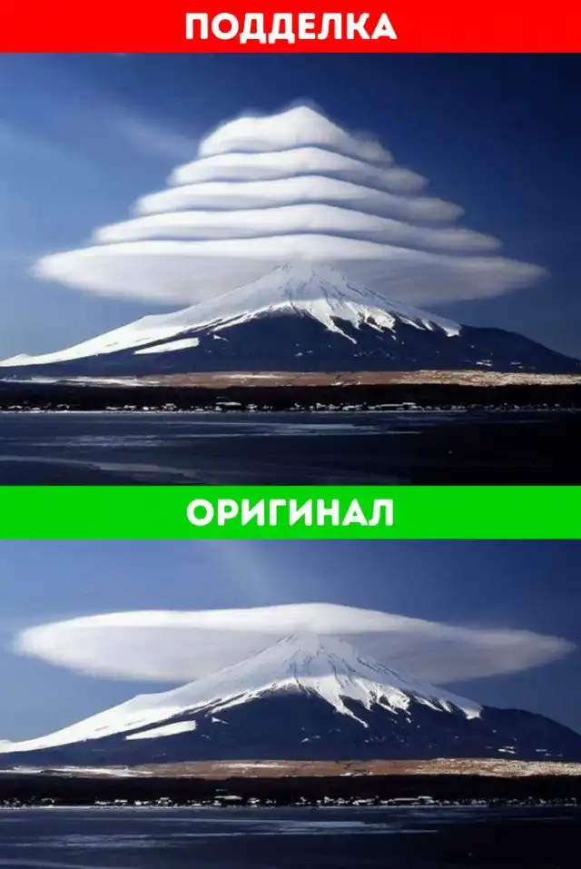 В сети фотографию сопровождали историей о том, что однажды пирамида из пяти облаков образовалась над горой Фудзи. Выглядит, конечно, эффектно. И хотя лентикулярные облака бывают слоистыми, на оригинальной фотографии облако было одно.
