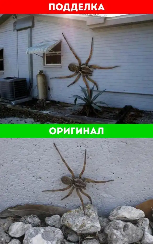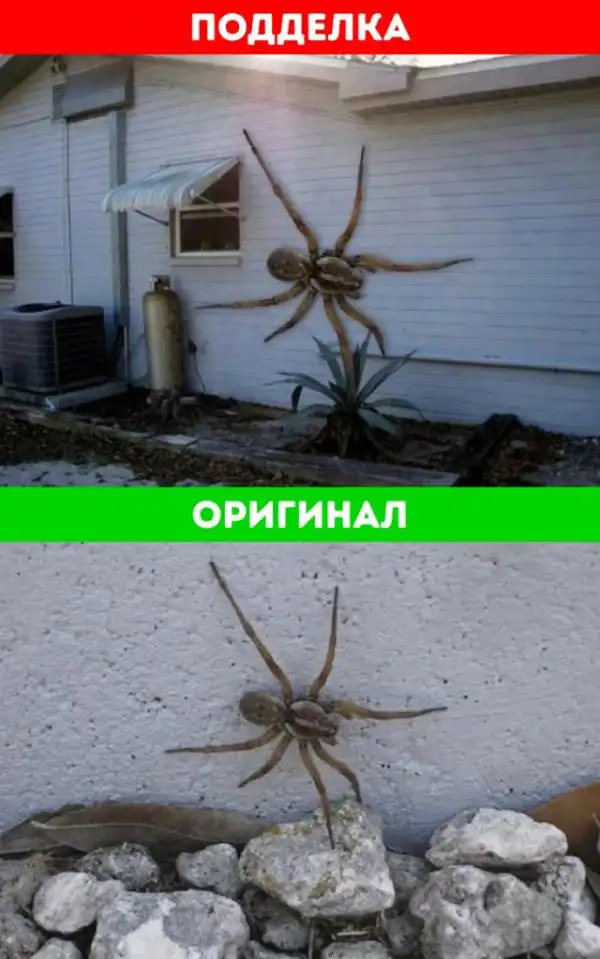 К счастью для людей, страдающих арахнофобией, эта фотография — подделка. Размер самых больших в мире пауков сравнивают с ладонью взрослого человека. Снимок сделал фотограф Поль Санта-Мария в 2011 году, когда обнаружил на заднем дворе своего дома во Флориде паука-волка. Он сфотографировал дом и поместил на его стену паука, увеличив последнего до гигантских размеров. Позже фотограф загрузил подделку на Facebook и добавил к ней подпись: «Ты уверен, что хочешь переехать во Флориду?»