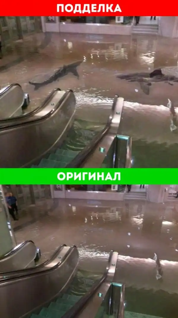 В 2012 году в соцсетях распространилась шокирующая новость о случае в Кувейте. Зал научного центра был затоплен после того, как разбился резервуар с акулами. На самом деле фотография не имеет никакого отношения к Кувейту. Этот снимок был сделан на железнодорожной станции в Торонто, когда во время ремонтных работ в канализации прорвало трубу.