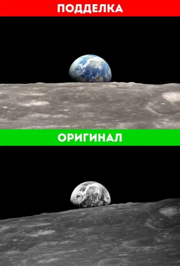 Как и в случае со снимком Индии, в соцсетях распространена цветная фотография восхода Земли. Оригинальный снимок с Apollo 8 был сделан в 1968 году и является черно-белым, а не цветным.