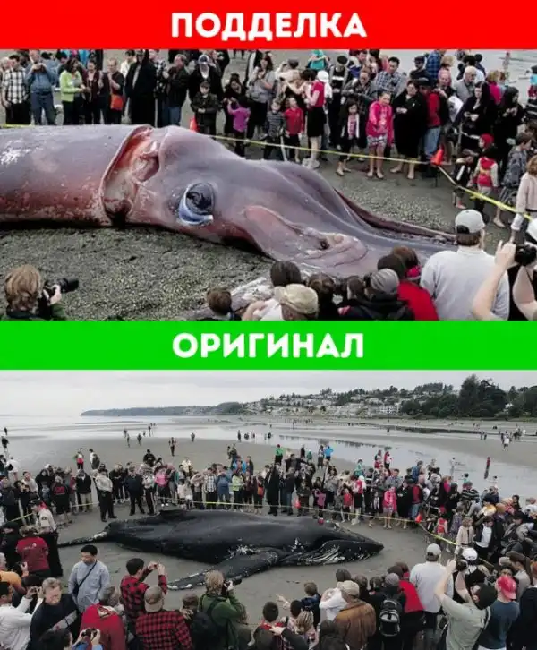 В марте 2015 года в сети появилась новость о гигантском кальмаре, которого выбросило на берег пляжа Пункайки в Новой Зеландии. Фотография оказалась очередной жертвой мастеров фотомонтажа. Оригинальный снимок был сделан в июне 2012 года на пляже Уайт-рок (Британская Колумбия, Канада), куда выбросило горбатого кита. Местные жители пытались спасти животное, но попытки оказались безуспешными.