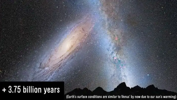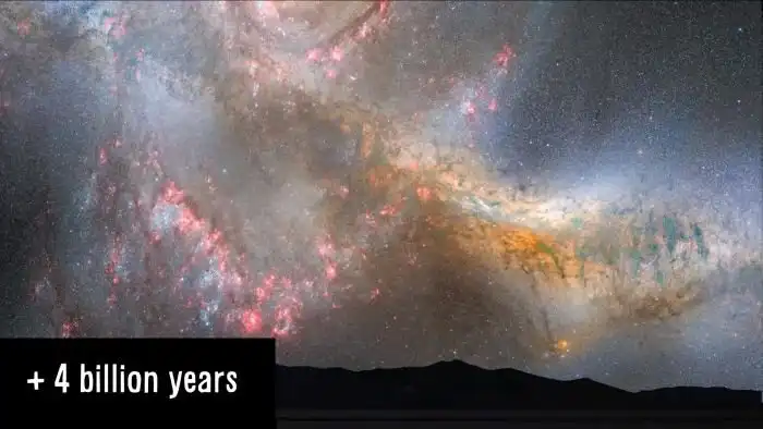 Астрономы подсчитали, что примерно через 4 миллиарда лет произойдет столкновение галактики Андромеды с Млечным Путем. После столкновения в течение 2 – 3 миллиардов лет обе галактики сольются в одну. Давайте взглянем на то, как это будет происходить.