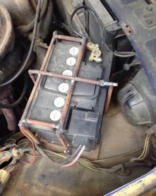 Вытащить аккумулятор из старенького автомобиля марки ВАЗ не составляет особого труда, а потому многие автолюбители предпринимают попытки защиты аккумулятора. На фото далее одна из подобных попыток.