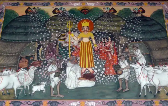 В 1463 году в Дешноке, где в то время жила Карни Мата, её пасынок Лакхан попытался испить воды из пруда и утонул. Существуют две версии о дальнейшем развитии событий. По одной Мать Карни стала молить о воскрешении мальчика бога Яму, но тот отказался оживлять ребёнка. Разгневанная Карни Мата пообещала жестокому Яме: все мужчины из её касты отныне никогда не попадут к богу. Они перевоплотятся в крыс, чтобы в следующей жизни снова стать людьми.
