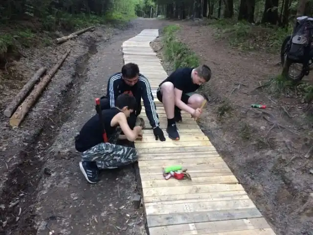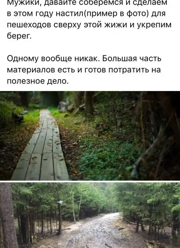 Парень решил, что было бы неплохо привести в порядок тропинку в лесу, которой пользуется немало людей. После дождей тропинка превращается в грязевое месиво, а потому решено было сделать деревянный помост.
